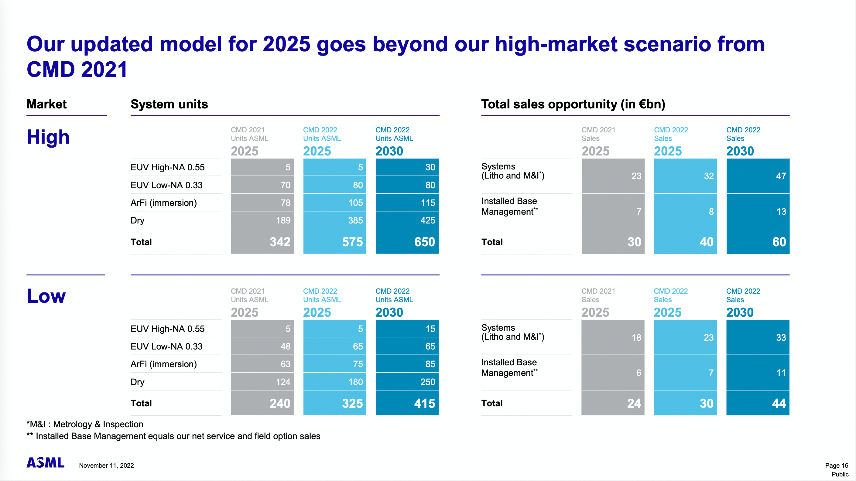 Enfin, le nouveau modèle de prévision d'ASML pour 2025 et 2030, opposant un scénario favorable et un second moins favorable.