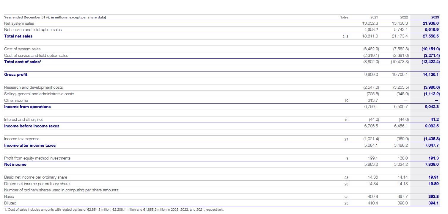 Quelques mots sur les finances d’ASML pour finir. Cela fait plusieurs années que l’entreprise se porte très bien, et les résultats de 2023 confirment sa bonne santé. Le chiffre d’affaires a fortement progressé l’année dernière. Il est passé de 21,1 milliards en 2022 à 27,6 milliards d'euros en 2023. Les bénéfices sont aussi au beau fixe, en hausse de 39 % sur un an : 7,8 milliards d’euros au lieu de 5,6 milliards d’euros.