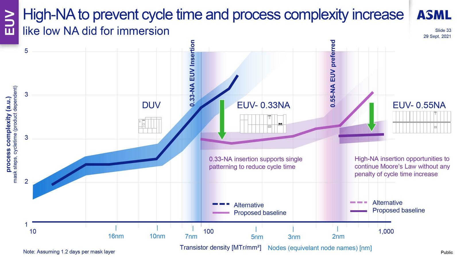 Avec les scanners DUV, la limite atteinte par ASML pour la longueur d'onde est de 193 nm. La lithographie EUV a réduit cette longueur à 13,5 nm. Résultat : en 2010, le premier système de test NXE (Low-NA) a abouti à un CD de 13 nm, contre un peu plus de 30 nm pour un scanner DUV. Les systèmes EXE (High-NA) EUV vont plus loin en jouant sur l'ouverture numérique, qui passe de 0,33 NA à 0,55 NA. Le CD descend ainsi à 8 nm. Cela ouvre la voie à des transistors 1,7 fois plus petits, pour des densités 2,9 fois supérieures à celles offertes par les systèmes NXE.