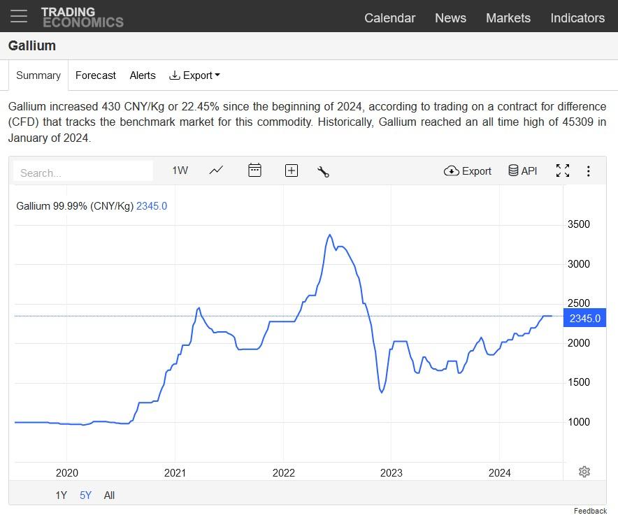Selon Freiberger Compound Materials, le plus gros acheteur de gallium au monde, cette décision avait entraîné la constitution d’importants stocks avant son entrée en vigueur ; entrée qui en vigueur qui avait momentanément causé l’arrêt des livraisons, le temps que les demandes de licences fussent traitées. De fait, le cours du gallium n’a cessé de grimper depuis, sans toutefois retrouver ses niveaux de 2022.