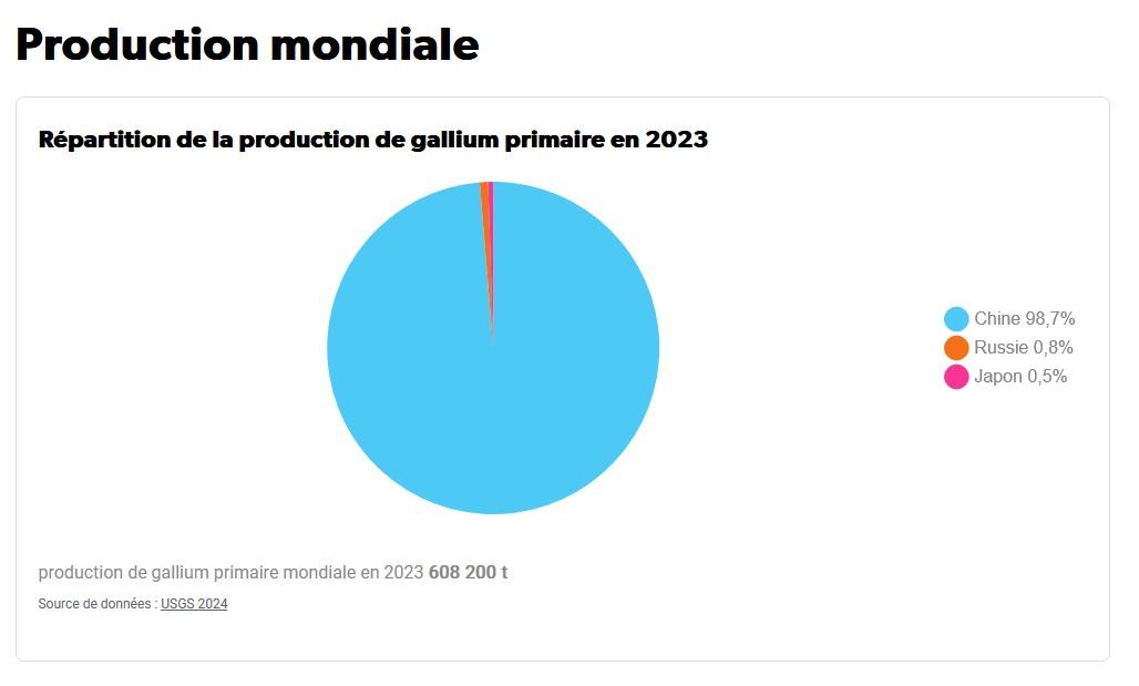 « Le 3 juillet, le ministère chinois du commerce a annoncé qu'à partir du mois d'août, il restreindrait les exportations de gallium et de germanium bruts ainsi que les produits dérivés de ces deux métaux. La Chine domine l'offre mondiale de ces deux éléments, qui jouent notamment un rôle significatif dans la production de semi-conducteurs pour les véhicules électriques, les infrastructures de télécommunications 5G, les technologies d'énergie renouvelable, ainsi que dans d'autres utilisations telles que l'éclairage LED, les câbles à fibres optiques ou diverses applications spatiales et militaires. Il s’agit de matières premières critiques pour la double transition vers un avenir numérique et neutre en carbone. »
