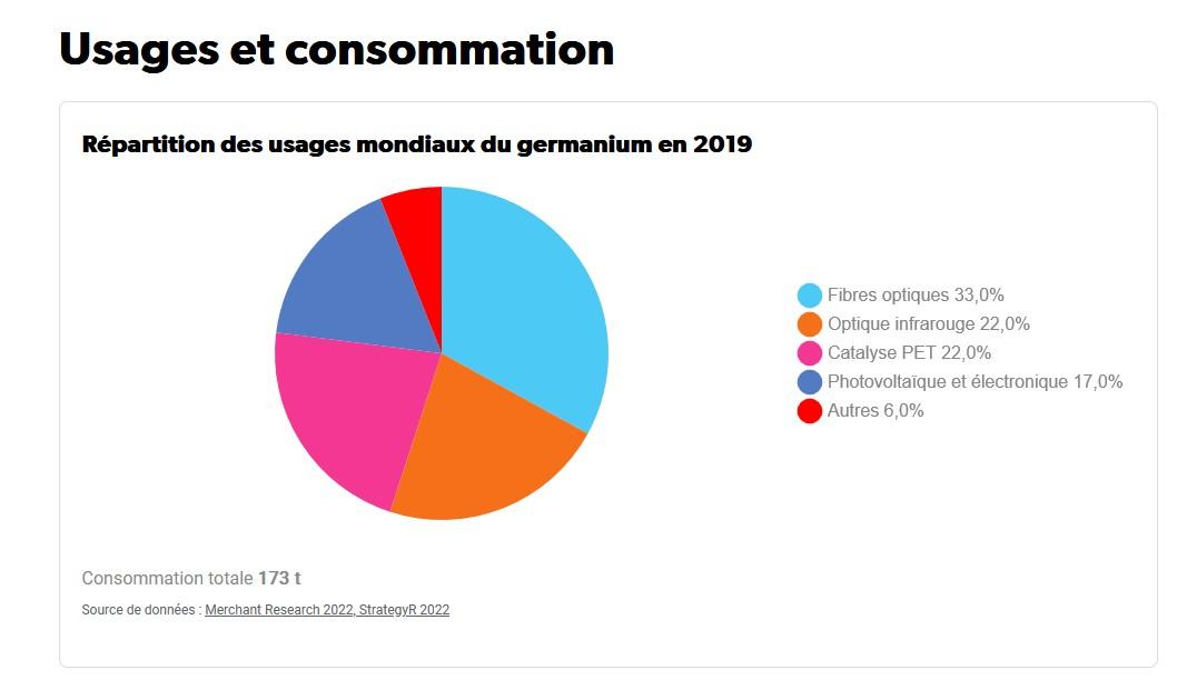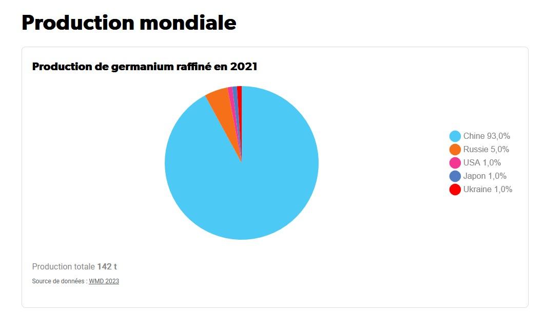 À propos du germanium, le site Minéral Info précise ainsi que « la production de germanium est liée aux production de zinc pour les trois-quarts mais aussi du charbon, principalement en Chine, et dans une moindre mesure en Russie et aux États-Unis ».