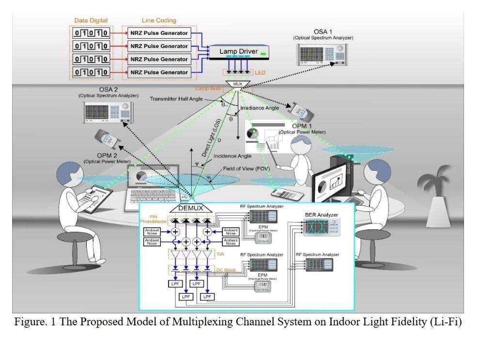 Voici deux illustrations. L'une émane du Li-Fi Group (Lifi.co) ; l'autre, plus aride, mais valable pour sa mise en situation, est tirée de l'étude Performance Analysis of Optical Channel Multiplexing System on Indoor Light Fidelity (Li-Fi).