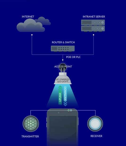 Sur le papier, le principe de fonctionnement est simple à comprendre. À l’instar d’autres technologiques optiques, le Li-Fi transmet des données via des signaux lumineux. Voici la manière dont Oledcomm, une société française, spinoff de l’université Paris-Saclay, résume cette transmission : « La transmission de données se fait par la modulation, invisible à l’œil nu, d’un signal lumineux émis par des LED. Le signal circule entre un dispositif émetteur (Access Point ou Antenne répéteur) équipé d’ampoules LED (c’est prosaïquement un routeur Li-Fi relié au réseau Internet par un câble Ethernet RJ45 avec capacité PoE), et un récepteur (Dongle) branché sur les appareils connectés. »