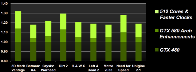 Autres points "optimisés" : la prise en charge du filtrage à pleine vitesse des textures FP16 (à l'instar du GF104 des GTX460, a priori plus une correction qu'une réelle nouveauté) et l'amélioration du z-culling (rejet des surfaces cachées inutiles à traiter). Au final, le GF110 de la GTX 580 est donc un GF100 dont toutes les unités ont été activées, cadencé plus rapidement et disposant de légères optimisations/corrections ! NVIDIA traduit les gains applicatifs de ces différents facteurs de la façon suivante :