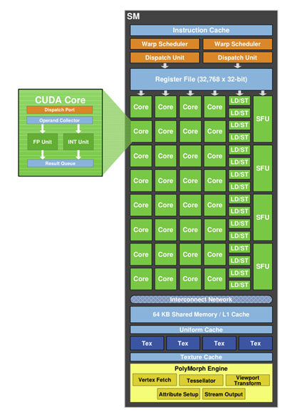 Elle s'articule autour de 4 GPC (Graphics Processing Cluster) liés à 6 contrôleurs mémoire 64 bits (disposant de 8 ROP chacun) et comprenant en leur sein un Raster Engine et 4 SM (Streaming Multiprocessors) chacun composé de 32 unités de calcul scalaires ou Cuda Cores, 4 TMU et un Polymorph Engine dédié à la géométrie et en particulier à la Tesselation dont on parle beaucoup avec DX11.