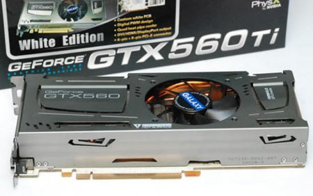 Galaxy, qui a laissé la place en Europe à sa division KFA2, lancera 2 cartes GTX 560Ti. Les deux auront un ventirad maison, classiquement un (deux) ventilateur(s) axial qui souffle en direction du GPU et des ailettes d'aluminium, la White Edition aura des fréquences légèrement poussées (835/1670/4000 MHz) et la GC sera plus overclockée (950/1900/4400 MHz), garantissant de bonnes performances. Comme on voit le GF114 en a encore dans le pantalon malgré ses fréquences de base déjà hautes, la lutte avec la HD 6950 d'un point de vue performance et tarif devrait faire des heureux chez les deux camps.
