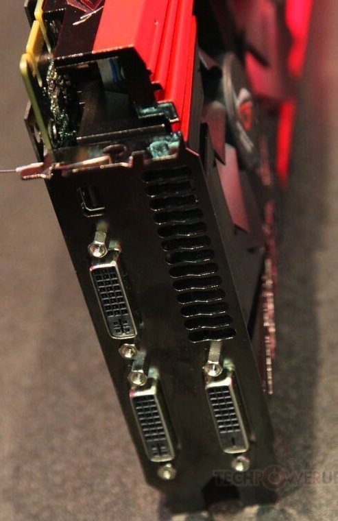Pour le reste de la carte, ou du moins ce que l'on peut en voir ce sont les trois connecteurs d'alimentations 8pins, qui laissent envisager qu'il sera possible de la "gaver" de courant et ravir les overclockeurs. Le petit bouton situé sur la gauche de ceux-ci permet en fait de forcer les trois ventilateurs du ventirad à tourner à 100%, un petit gadget qui pourra être appréciable pour l'overclocking. Les sorties vidéos sont au nombre de 4 avec trois DVI et un mini Display Port.