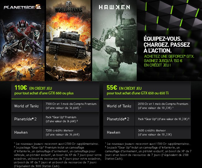 En effet, aucun jeu à proprement parler dans le bundle, mais 3 titres tout de même ciblés : World of Tanks, Planetside2 et Hawken. 3 jeux qui sont en fait des free-to-play, mais comme vous le savez les free-to-play sont pour beaucoup finalement des "pay-to-win", aussi Nvidia propose en fait des bonus payants pour ces titres à tout acheteur donc d'une GTX 650 ou plus !