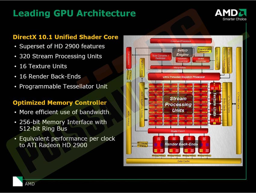 On retrouve quasiment tout ce qui faisait la force du R600, hormis le bus mémoire qui subit un lifting en passant à 256 bits, tout comme le 8800GT. Les 320 Stream processors sont encore là, et certainement nettoyés des bugs (ROPs) du R600.