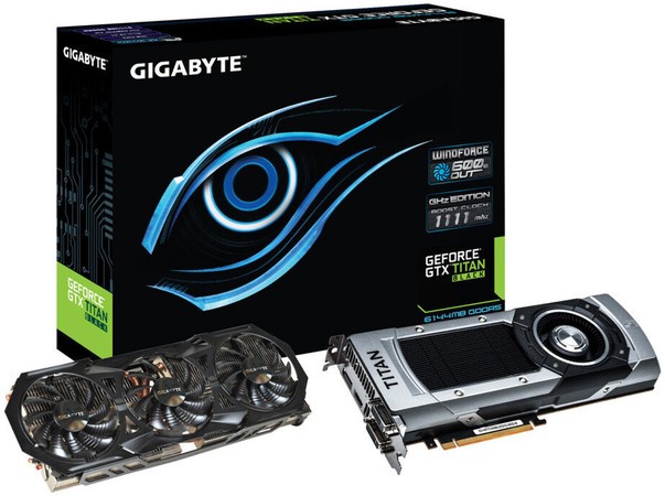 Dans la boiboîte, vous trouverez une GTX Titan Black équipée de son dissipateur pas du tout black et ayant le droit de tourner à 1006/1111MHz base/boost pour le GPU au lieu de 889/980MHz et 7000MHz (fréquence de base) pour les 6 gigots de GDDR5 sur bus 384-bit. La bestiole standard avec ses 2880 coeurs CUDA, mais des fréquences revues à la hausse donc. Pour refroidir cet excédent de puissance, ils y glissent aussi un WindForce 3X 600W qu'il vous faudra monter avec vos petites mimines. Ce bundle porte le doux nom de GV-NTITANBLKGHZ-6GD-B (ou GTX Titan Black GHz), reste à savoir le tarif de la chose. Un site allemand la référence à 910€, un prix étonnant quand le modèle de référence de chez Gigabyte tourne autour des 990€. (Source : TPU)