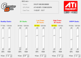 Le célèbre site de Hardware allemand Computerbase.de vient de mettre en ligne la version 0.9 de son logiciel de gestion de bios pour HD3800. Sont donc supportées les HD3850, HD3870 et surtout... la HD3870 X2 ! Il vous est ainsi possible de configurer les fréquences GPU et mémoire dans toutes les situations, du boot du PC à la 3D en passant bien sûr par la 2D pour limiter la consommation de votre carte lorsque le PC est au repos. Cerise sur le gateau, la tension du GPU est également accessible via le logiciel et fonctionnelle avec la HD3870 X2, de quoi peaufiner vos réglages et rendre votre carte aussi douce en 2D que bestiale en 3D. Bon réglages !