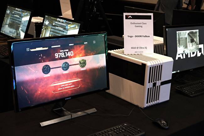 Toutefois, la carte MI25 était installée dans une tour Corsair Carbide A240, et faisait tourner Doom sous Vulkan en UHD tous les détails à fond à plus de 60 images par seconde. Certes c'est joli mais pas impressionnant pour plusieurs raisons. Doom n'est pas le plus gourmand des jeux, et de plus il utilise une API assez peu utilisée actuellement, qui va en confrontation directe avec DX12 mais aussi DX11. Ces scores ne reflètent donc pas la tenue de la carte sous DX. Ce n'est qu'un aperçu mais cette exhibition montre que ça avance bien, et que les rumeurs de VEGA cette année dans des cartes grand public dès le mois d'octobre étaient des grosses vannes.