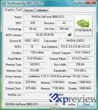 Expreview a mis en ligne une capture de GPUZ de la 9800GTX. Toujours selon le site, GPUZ 0.1.7 ne reconnait pas la carte, à moins de bidouiller le logiciel, chose qu'a fait Expreview. Dans ces conditions, voilà le screen de confirmation de tout ce qui a été raconté sur la 9800GTX depuis quelques jours. Le core est bien à 675 MHz, les shader à 1688 MHz et les 512 Mo de GDDR3 0.8ns sont à 1100MHz. Hormis la mémoire, le choix des fréquences est peu judicieux, il faudra donc voir en conditions réelles ce que vaut cette dernière.