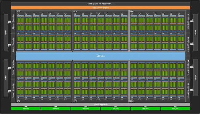 Il y aura 16 gigots maxi de mémoire HBM2 Samsung qui offriront une bande passante de 900Go/s à 878 MHz, le tout sur bus 4096-bit. Enfin le GV100 de la carte de lancement moulinera à 1455 MHz via turbo. Ce monstre, parce que c'en est un, est constitué de 6 GPC comprenant 7 TPC pièce. Chaque TPC comporte 2 SM, chaque SM compte quant à lui 64 cœurs CUDA. Ce n'est pas tout, chaque SM comprend 4 blocs identiques, chacun possédant 8 registres FP64, 16 INT32 et 16 FP32, et 128 tensor cores (unités spécialisées pour optimiserles calculs sur l'IA et le Deep Learning), en sus d'un cache L0 et d'un scheduler, sans oublier le registre des files à traiter.