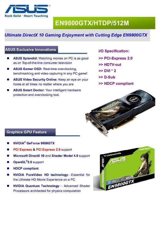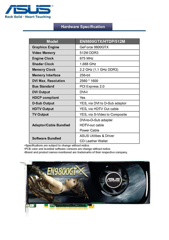 La 9800GTX d'Asus a en effet été dévoilée, avec slides de présentation et photos à la clé. Son doux petit nom sera EN9800GTX/HTPD/512M et respectera les caractéristiques de base maintenant connues depuis un moment, à savoir des fréquences de 675/1688/2200 (gpu/shaders/ram), 512Mo de GDDR3, le PCIe 2.0, DirectX 10.0 (seulement) et le Triple-SLI. Un modèle pas spécialement enthousiasmant donc, mais il y a fort à parier qu'une 9800GTX TOP suive rapidement, courant avril, avec des fréquences revues à la hausse, et pourquoi pas de beaucoup, Asus ayant une politique d'overclocking assez agressive sur ses modèles "TOP". En attendant voici une petite photo de la carte, et en suite de la news les 2 slides de présentation de la carte avec ses fonctionnalités et caractéristiques détaillées. (Source: TechConnect Magazine)