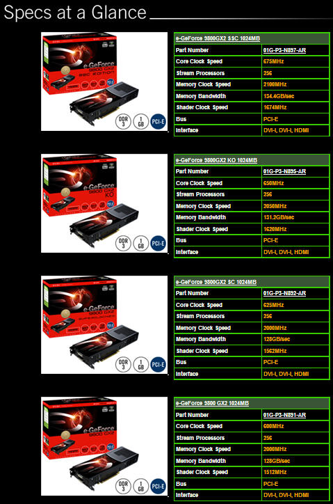 Le fabricant de cartes graphiques EVGA vient d'annoncer le pasage de sa gamme 9800GX2 1Go à quatre modèles, dont trois overclockés d'origine. On retrouve tout d'abord la e-GeForce 9800GX2, modèle de référence cadencé à 600/1500/2000 (gpu/shaders/ram). Vient ensuite la 9800GX2 SC qui a elle un très léger overclocking GPU avec 625MHz, ainsi qu'au niveau des shaders avec 1562MHz. La GDDR3 demeure à 2000MHz. La 9800GX2 KO, comme chaque fois chez la marque est elle le 2è modèle le plus puissant, avec ici 650/1620/2050. Enfin le haut de gamme est lui représenté par la fameuse série SSC, avec un overclocking à 675/1674/2100. Des fréquences qui talonnent donc celles de la 9800GTX (675/1688/2200), et comme les GPUs sur les 2 cartes sont des G92 dotés de 128 Stream Processors, on peut en déduire que cette petite 9800GX2 SSC aura à un rien près les performances d'un SLI de 9800GTX, impressionnant tout de même... (Source: VR-Zone)