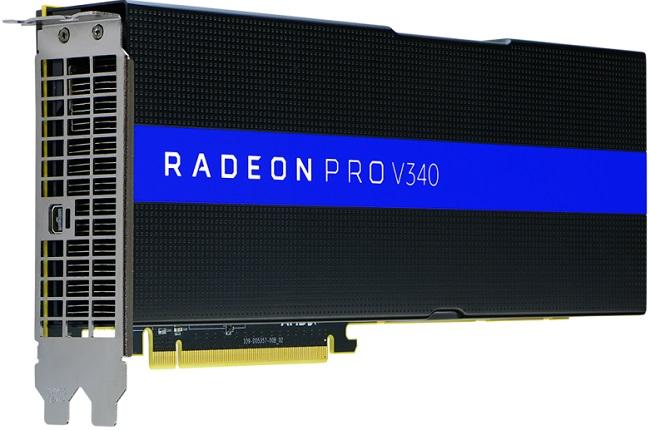 Pour les pros, on retrouve une compatibilité avec pas moins de 32 machines virtuelles par carte, deux systèmes d'encodage H.264/H.265 virtualisés, et - bien sûr - le classique refroidissement "passif" commun à toutes les cartes destinées au marché "serveur de calcul professionnel" (et vive la climatisation !). A ce sujet, le TDP reste modéré pour deux VEGA, avec "seulement" 300W et une alimentation à deux connecteurs 8-pin. On notera tout de même le minuscule port mini-DP sur la face arrière, qui ne manque pas de ridicule pour une carte de cette puissance.