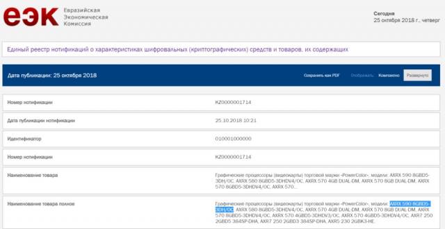 En tout cas, on peut clairement y voir qu'une RX 590 est venue s'ajouter à côté des autres RX 580 et 570 du constructeur, enregistrée en tant que AXRX 590 8GBD5-3DH/OC depuis le 25 octobre seulement. L'obtention de la certification auprès de l'EEC - Union Économique Eurasienne - est habituellement l'une des dernières étapes avant de pouvoir lancer un nouveau produit sur le marché, autrement dit cette fameuse RX 590 pourrait finalement très bien débarquer d'ici quelques semaines, et chez PowerColor peut-être sous la forme d'une Red Devil.