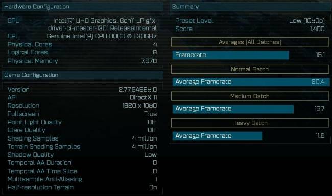 Par rapport à une HD 620, l'iGPU inchangé depuis Skylake, la nouvelle double quasiment les scores : passage de 8,1 à 15,1 images par seconde en moyenne, avec une belle performance de 20,4 FPS contre 9,6 pour les tests catégorisés "normaux" (15,7 vs 8,2 en "moyen" et 11,6 contre 6,9 pour en "lourd"). Bien évidemment, impossible de comparer avec la fuite précédente, car il s'agit ici du test en préréglage de qualité "bas" alors que le précédent était en "haut", tous deux en 1080p. Pas étonnant donc que le premier arbore un fier 8,9 FPS de moyenne (contre moins de 6 pour la HD 620) ! On notera cependant des similarités sur la partie CPU avec 4 cœurs / 8 threads à chaque fois malgré des fréquences de 1,30 GHz contre 2,10 GHz et une version du pilote qui passe de 2.77.54698.0 pour le bench le plus récent à 1.50.24210.0. Optimisation des drivers ou fake ? Nous vous laisse seuls juges ! (Source : Tum Apisak via NotebookCheck)