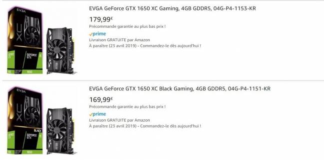 Au total, on retrouverait 4 cartes sur deux design distincts : la 1650 XC Gaming et la 1650 XC Black Gaming qui partageraient les mêmes couleurs et le même radiateur à un moulin - pas plus de noir pour la black, belle ironie - mais seraient séparées de 10€ avec respectivement 169€99 et 179€99. Pour la version à deux ventilateurs, il faudrait plancher sur la XC Ultra Gaming (179€99 toujours) ou la XC Ultra Gaming Chauve Black (189€99), et vive le pipotron ! Par rapport à une GTX 1050 qui se négocie plus vers les 130€, le surcoût serait conséquent : la gamme semble glissertoujours plus vers le haut en proposant au niveau tarifaire quelque chose de l'ordre de la 1050 Ti. Rappelons tout de même que rien n'est officiel encore, et que ce genre de promesse tarifaire n'engagent que ceux qui y croient... Ce n'est par ailleurs pas la seule à fuiter : à l'heure à laquelle nous écrivons ces lignes, un modèle similaire à un moulin de chez Zotac est également précommandable pour un tarif plus doux de 149€99.