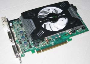 Dire que cette carte est jolie n'est pas une vérité. Dire que cette carte ttire l'oeil est plus proche de la vérité. Nos confrères de PCInpact ont testé la Twintech 9600GT qui est overclockée d'usine à 700/1750/1100 MHz pour le core/shader/mémoire. Ce qui devrait vous frapper c'est la fréquence de la mémoire, qui de base se situe à 900MHz, et qui pointe à 1100MHz ici grace à de la mémoire Samsung 0.8ns. La carte n'a pas que cela comme atout puisque pour l'occasion, le ventirad de base cède sa place à un autre plus gros, avec caloducs et ventilateur plus grand. AInsi ces petits plus mis bout à bout majorent le prix de 30€, aussi la question que s'est posé PCI est de savoir si ces ajouts valaient vraiment ce prix. La réponse est, comme dirait Sam, ce philosophe célèbre de TF1, au bout du couloir!