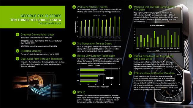 Tout ça, c'est bien beau, mais qu'en est-il des specs des 3 cartes lancées ? Nvidia est resté tout de même opaque sur bien des éléments, il voit son flagship gaming comme étant la RTX 3080, capable d'avoir jusqu'à 2x plus de performance que la RTX 2080. La cadette de la gamme se nomme la RTX 3070, et celle-ci viendrait battre la RTX 2080 Ti, et coller 60% à la RTX 2070. Quant à la RTX 3090, Nvidia la voit surtout comme un monstre gaming (1,5x Titan RTX), mais destinée avant tout à ceux qui veulent bosser, et à ce titre elle vient fatalement coller une trempe à tout le monde, y compris pour le prix. C'est un marché de niche qui sera concerné, mais les plus fortunés, ceux qui n'ont pas hésité sur la RTX 2080 Ti, pourraient facilement basculer vers le Graal vert.