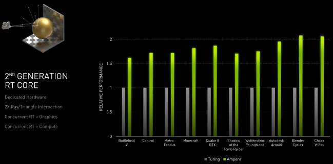 Nvidia passe des RT-OPS pour quantifier la puissance de ses cartes RTX en Ray Tracing (une unité de mesure nous ayant laissés pour le moins dubitatifs) au RT-TFLOPS sans préciser exactement ce qui se cachait derrière. Nul doute que des détails émergeront dans les jours qui viennent. Toujours est-il qu'avec Ampere, le caméléon annonce avec sa seconde génération de RT Cores, des gains allant de 60 à 100% sur les jeux qui sont capables de RT, et sur des applications accélérées par ces fameux cœurs. Les gains les plus élevés correspondent surtout aux applications de boulot, mais des jeux comme Minecraft ou Quake II RTX, les plus évolués au niveau de l’intégration de cette technologie, en tirent clairement parti. Là aussi, des détails seront nécessaires pour comprendre clairement l'origine de ces gains. À noter également que les Tensors Cores évoluent, avec à la clef des performances en hausse très notables (sans précision quant aux types de calcul profitant de ces gains), ce qui pourrait augmenter encore les performances du DLSS qui en tire parti.