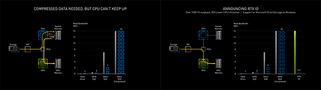 La sortie HDMI est enfin à la norme 2.1, par contre petite déception, le DisplayPort reste en 1.4a alors que la version 2.0 est officielle depuis plus d'un an. En pratique, il ne limitera que bien peu de monde, surtout avec son complément DSC. Le port VirtualLink pour VR n'ayant à priori pas été adopté par les constructeurs de casques, il disparaît des nouvelles venues. Un mot sur RTX IO, un technologie destinée à utiliser le GPU pour une décompression ultra rapide des données compressées en provenance du stockage. De quoi augmenter drastiquement le débit effectif des données transférées et ce via l'utilisation de l'API Microsoft DirectStorage, "by-passant" le CPU pour ces tâches, le libérant ainsi pour d'autres, tout en limitant le risque de saturation des interfaces liées. De quoi concurrencer la PS5 et son sous système de stockage vanté par ses créateurs, et ce avant même la commercialisation de cette dernière ?