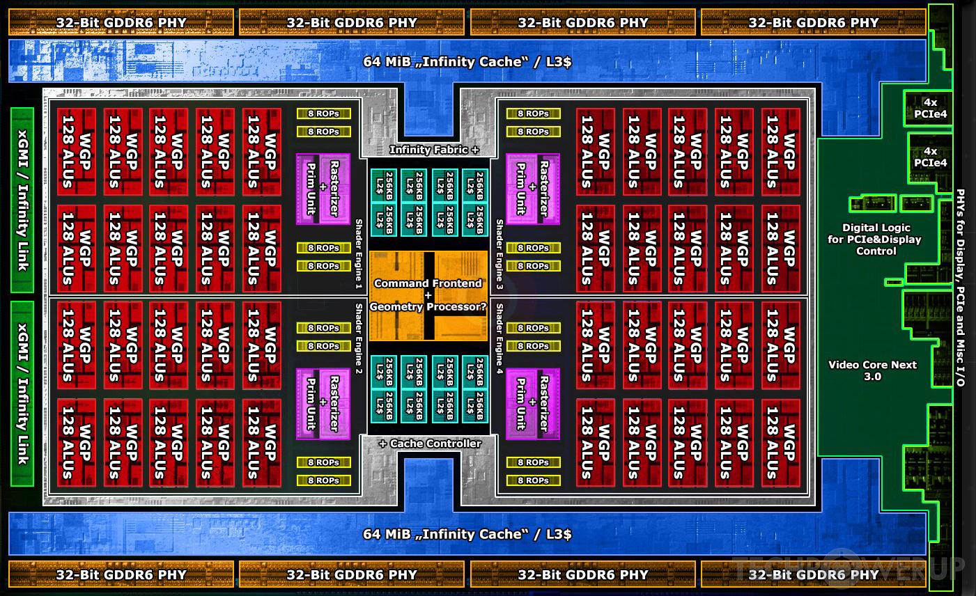 Pour ce qui est de la terminologie, les WGP sont les Work Group Processors, le nouveau nom des Compute Units depuis RDNA, regroupant ce qui s’apparente à une fusion de deux anciens CU, parfois nommée Dual Compute Unit. C’est à l’intérieur de ces unités de calcul que devraient se situer les fameux accélérateurs de Ray Tracing, bien que cela ne se voit pas sur ce schéma.