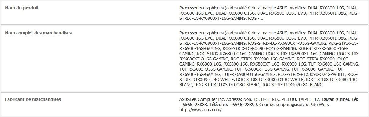 Passage obligatoire avant la commercialisation dans la région, l'enregistrement réalisé par ASUS le 19 novembre auprès de l'office de régulation EEC - Eurasian Economic Commission - est de taille, avec pas moins de 30 nouvelles références déposées. Comme d'habitude, ça ne signifie pas que chaque modèle verra bien le jour sur le marché, mais cela donne une bonne idée des plans du géant taïwanais pour les derniers GPU de Nvidia et AMD. En effet, on y trouve un peu de tout : de nouvelles références RX 6800 et RX 6800 XT, des versions blanches ROG Strix du très haut de gamme Ampere RTX 3090, une seule RTX 3060 Ti pour l'instant dans la gamme Phoenix, et plus notablement 7 références de RX 6900 - avec un modèle présumé de référence RX6900-16G, mais aussi des variantes TUF et ROG Strix, donc sous-entendu des modèles customisés !