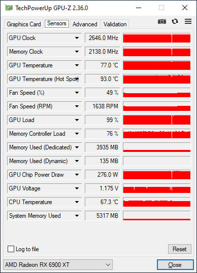 Jusqu'où peut-on pousser nos cartes ? AMD autorise bien entendu l'overclocking (sans garantir la carte si on s'adonne à cette activité toutefois), mais comme nous l'avons identifié précédemment, la RX 6900 XT est totalement piégée par sa limite de puissance. Cette dernière peut être relevée de 15 % au maximum, ce que nous avons fait. Côté mémoire, AMD limite aussi la valeur maximale accessible à 2150 MHz (2138 MHz appliqués réellement). Si les 6800 et 6800 XT n'ont aucun souci pour passer cette valeur, ce n'est pas le cas de notre 6900 XT. Pas d'artefacts ou plantages, mais des performances qui baissent, parfois très sensiblement. Nous avons donc du nous limiter à + 100 MHz réels, au-delà les performances commencent à chuter sur notre exemplaire. Du coup, il est plutôt aisé d'afficher des fréquences clinquantes, mais cela n'a de sens que lorsque les performances suivent ce qui n'est pas le cas de cet exemple, avec une perte de près de 20 i/s au niveau de notre scène de test !
