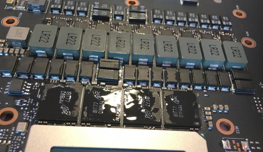 Dans le cas des carte graphiques, la mémoire n’est théoriquement pas le composant dégageant le plus de chaleur - tout du moins, pas dans une utilisation de jeu pur - des gros pads ont donc souvent été employés. Or, la GDDR6X semblerait être assez gourmande, et l’espace entre le composant et le radiateur trop variable entre cartes d’un même modèle. De ce fait, certaines tourneraient sans aucun souci, alors que d’autres écraseraient le pad jusqu’à ne faire contact qu’avec le matériau structurel. Résultat : le silicone fuirait peu à peu, formant une tache caractéristique sur le PCB et dégradant la conductivité thermique, jusqu’à ce que la puce s’imprime totalement sur le pad et finisse par surchauffer. Il s’en suit du throttling thermique à gogo, puis le décès de la belle... ouille !