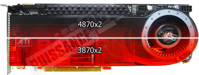 A l'approche de l'arrivée de la HD4870 X2, certains commencent à casser leur cochon-tirelire et compter les euros pour voir si le budget permettra cette petit folie le mois prochain, mais une autre question est également sur beaucoup de lèvres: voici une nouvelle carte d'une longueur phénoménale, rentrera-t-elle dans mon boîtier ? Est-elle encore plus longue que la HD3870 X2, la 9800GX2 et toute la clique des modèles de 27cm de long ? Nous vous proposons un petit montage photo que nous venons de faire du cliché de la HD4870 X2 avec son refroidissement, sur lequel nous avons ajouté la photo de la Sapphire HD3870 X2 à la même échelle. L'occasion de constater que les 2 PCB se superposent parfaitement, la HD4870 X2 perpétue donc la génération des cartes haut de gamme de 27cm de long, mais n'établit en tout cas pas un nouveau record de démesure (j'en vois déjà souffler un bon coup).