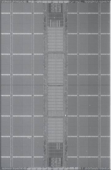 Ainsi, le die principal dévoile des structures relativement régulières mêlant unité de calcul et mémoires tampons, les contrôleurs PCIe étant visibles sur le bas droit de la puce, et ceux pour la HBM sur les extrémités droites et gauches. Justement, la mémoire également eu droit à son cliché, de quoi admirer la régularité des motifs employés caractéristique des designs des caches sur silicium. Un vrai plaisir !