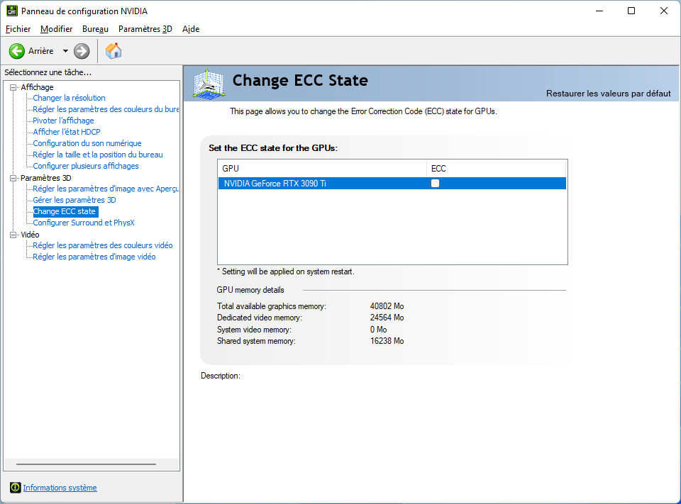 À noter que le caméléon a ajouté dans ses pilotes l'activation de la correction d'erreur de la GDDR6X, si cette dernière est de type ECC. Nous avons voulu vérifier l'impact sur les performances de cette fonctionnalité, malheureusement en cochant la case, après le démarrage est requis, la case reste désespérément inactive, Asus n'ayant pas opté pour des puces ECC.