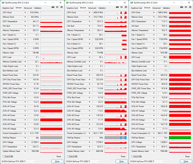 Au repos, le GPU se stabilise à 210 MHz et la mémoire à 51 MHz. En charge, nous avons réussi à mesurer un pic à 2055 MHz. Par contre et en toute logique, la fréquence chute en jeu (Cyberpunk 2077) pour se conformer aux températures et enveloppe de puissance maximales autorisées. On obtient une fréquence qui finit par osciller légèrement entre 1980 et 2010 MHz, avec une valeur moyenne durant 30 min s'établissant à 2 GHz (1989 MHz en mode Quiet), soit 7,5 % de mieux que le boost officiel indiqué (plus de détails page 7).