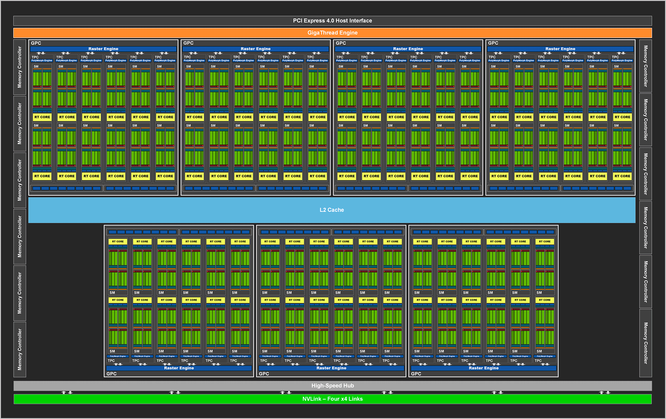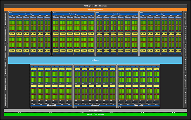 Comme vous pouvez le constater, la RTX 3090 affiche des caractéristiques très proches, avec près de 98 % des unités actives. La 3080 Ti n'est elle-même pas bien loin, puisque disposant de 95 % des unités actives. Difficile donc à première vue de ne pas créer un nouveau modèle marchant sur les pieds des 2 autres. Afin d'éviter une telle promiscuité, les verts ont joué sur d'autres éléments que les caractéristiques intrinsèques du GPU. D'une part, l'utilisation de puces mémoires plus véloces (21 Gbps au lieu de 19,5 / 19 Gbps), permet d'augmenter de respectivement 7,6 et 10,5 % la bande passante par rapport aux RTX 3090 / 3080 Ti. Ensuite, la limite de consommation passe de 350 W sur ces 2 modèles, à 450 W sur la nouvelle venue. Cela permet de compenser la surconsommation liée à la mémoire, mais également de donner plus de marge au GPU pour maintenir des fréquences élevées, et ce malgré l'inflation du nombre d'unités actives. De quoi afficher une fréquence de Boost officielle en hausse de 9,7 % par rapport à la RTX 3090, nous vérifierons ce qu'il en est en pratique. Voilà pour les spécificités de ce nouveau modèle utilisant un GA102 intégral dont vous retrouverez le diagramme ci-dessous.