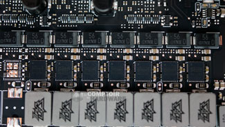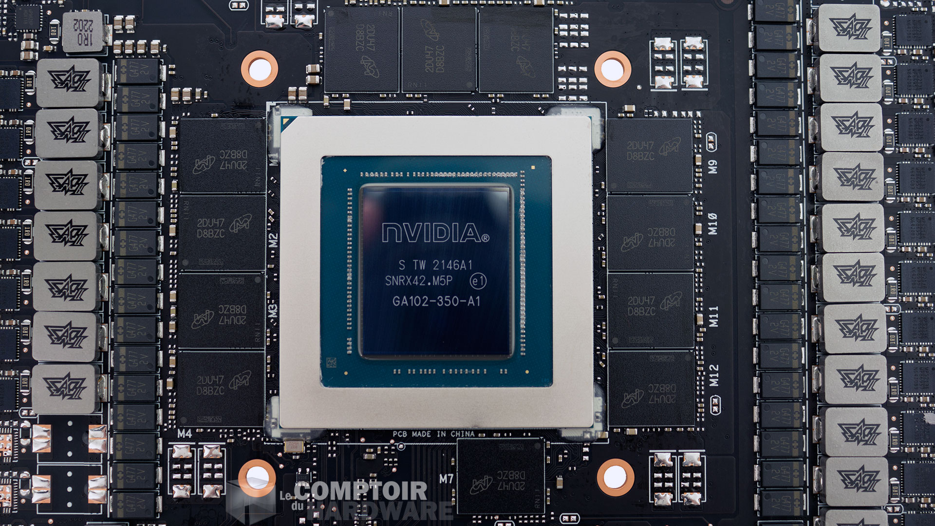 Les puces V-Ram d'une capacité de 2 Go, sont de type GDDR6X. Elles sont produites par Micron et certifiées pour un débit de 21 Gbps, soit 1313 MHz. GA102 dans sa version complète est sérigraphié "350", il ne s'agit toutefois pas d'un nouveau stepping, la puce restant en révision A1.
