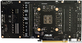 Petit zoom sur la plaque arrière : ASUS ayant opté pour la disposition de nombreux éléments de puissance au dos du PCB, des pads thermiques assurent le contact entre ces derniers et la plaque arrière, faisant office de dissipateur passif.