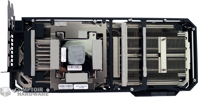Le dissipateur actif est lui, constitué d'un énorme radiateur (en plusieurs parties) à base d'ailettes en aluminium, parcouru par 6 caloducs en cuivre nickelé. ASUS a opté pour le même matériau au niveau de la surface de contact avec les puces mémoire et le GPU. Le contact thermique est assuré au travers d'une pâte thermique à base d'argent et de pads thermiques. Nous jugerons un peu plus loin dans le dossier, l'efficacité de ce radiateur. Les autres éléments dégageant beaucoup de chaleur sont refroidis par des inserts en aluminium, servant également de point d'ancrage pour le carénage. Des pads assurent là aussi l'interface thermique nécessaire.