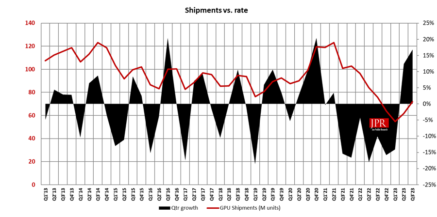 À l'image du secteur du PC tout entier, les choses vont encore mieux sur ce troisième trimestre 2023. Elles vont même bien mieux dans la mouvance de Q2 qui affichait déjà des tendances haussières et un peu de sucre glace du côté de chez AMD. Aussi après avoir repris des couleurs sur ce Q2, c'est carrément vamos a la playa sur ce troisième trimestre avec + 16,8 % d'expéditions par rapport à Q2, qui était lui déjà donné pour un joli +11,6 % par rapport à Q1. Un rebond tel que le cabinet à la source de ces tendances, le célèbre JPR, de déclarer « la période morne post-Covid est terminée ».