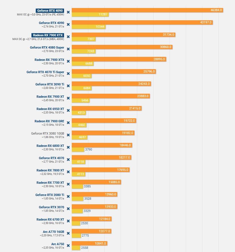 Si au foot, le PSG, le Real Madrid et Manchester City dominent inlassablement leurs rivaux nationaux, sur le terrain des GPU, vous avez la GeForce RTX 4090 dans ce registre. La porte-étendard des Ada Lovelace domine aussi ce classement Nomald Light avec 46 384 points / 43 197 points (OC / non-OC). Sa dauphine est la Radeon RX 7900 XTX OC avec 31 734 points. Enfin, à la troisième place et 30 860 points, la GeForce RTX 4080 Super talonne la championne d’AMD.