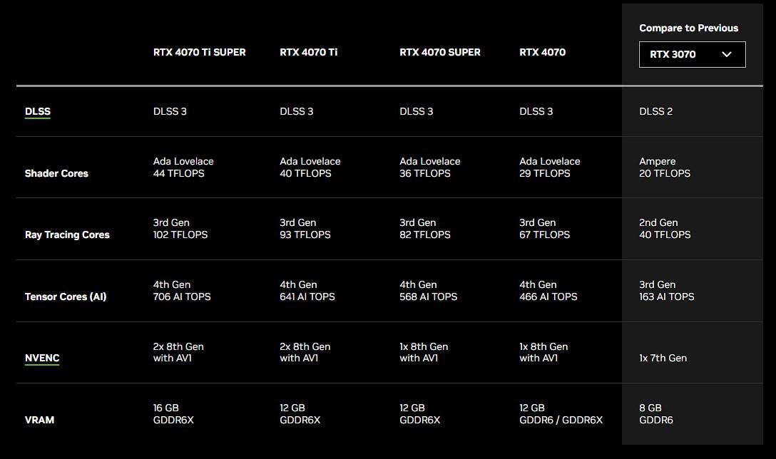 | Carte graphique | RTX 4070 GDDR6 | RTX 4070 | RTX 4070 SUPER |