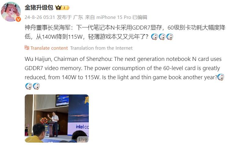 Les deux principaux renseignements ont trait à la VRAM et à la puissance des GPU de la série RTX XX60. Pour le premier point, Wu Haijun confirme la distribution de GDDR7 à l’ensemble de la série — en tout cas, au moins jusqu’à la GeForce RTX 5060.