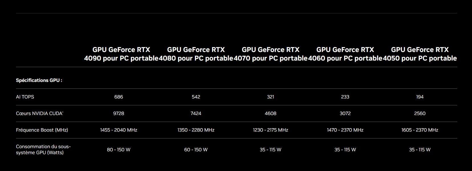 À propos de cette carte graphique justement, la source mentionne une réduction de la consommation maximale de 140 W à 115 W. Cette déclaration est quand-même tendancieuse. Vous le constaterez avec le tableau ci-dessous, officiellement, NVIDIA renseigne déjà un TGP max de 115 W pour la RTX 4060. Il existe bien de rares références à une puissance de 140 W sur le site de l'entreprise. Par exemple, dans la campagne Back to school, NVIDIA précise que des résultats ont été obtenus avec « un GPU GeForce RTX 4060 pour PC portable avec puissance graphique maximale de 140 W ».