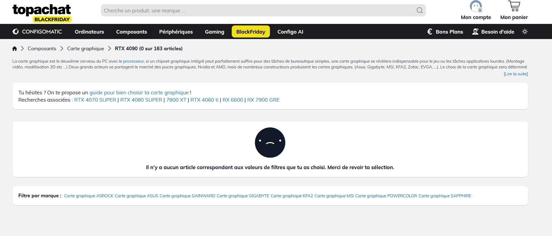 Vous avez peut-être remarqué que l’offre de GeForce RTX Ada Lovelace haut de gamme a commencé à s’étioler depuis quelque temps. La source précitée avait annoncé que NVIDIA avait stoppé la production des GPU AD102 qui servent aux RTX 4090 / RTX 4090D fin septembre. Cette assertion s’est vérifiée : et face à une baisse de l’offre, le prix de ces cartes n’a cessé de monter. Aujourd’hui, si Amazon propose encore quelques RTX 4090, dont certaines à des prix délirants (l’ASUS ROG Strix GeForce RTX 4090 24 Go OC Edition s’affiche à 3407 euros), de tels spécimens ont totalement disparu de chez LDLC et TopAchat. Chez ce dernier, la mention RTX 4090 n’apparaît même plus dans le formulaire de sélection.