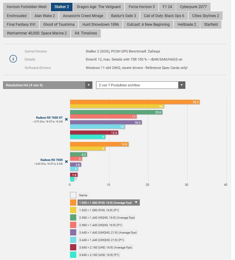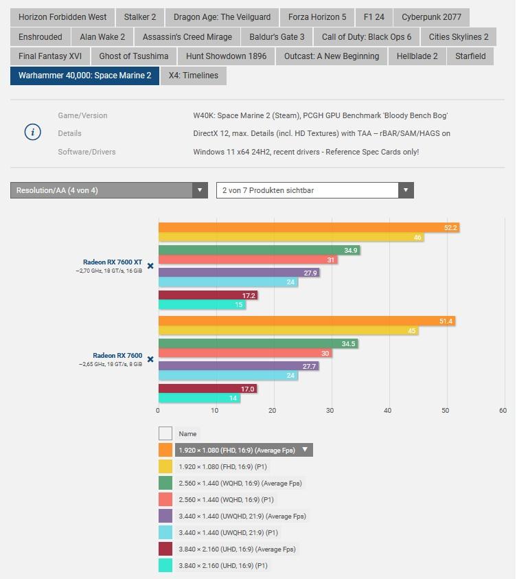 À l’inverse, lorsque vous regardez Warhammer 40K Space Marine 2, le titre rastérisé où la marge est la plus faible, la RX 7600 XT a une moyenne de 52,2 IPS (46 IPS pour les 1 % Low), la RX 7600 de 51,4 IPS (45 IPS pour les 1 % Low) en FHD ; ces valeurs sont de respectivement 17,2 / 15 et 17 / 14 en UHD.