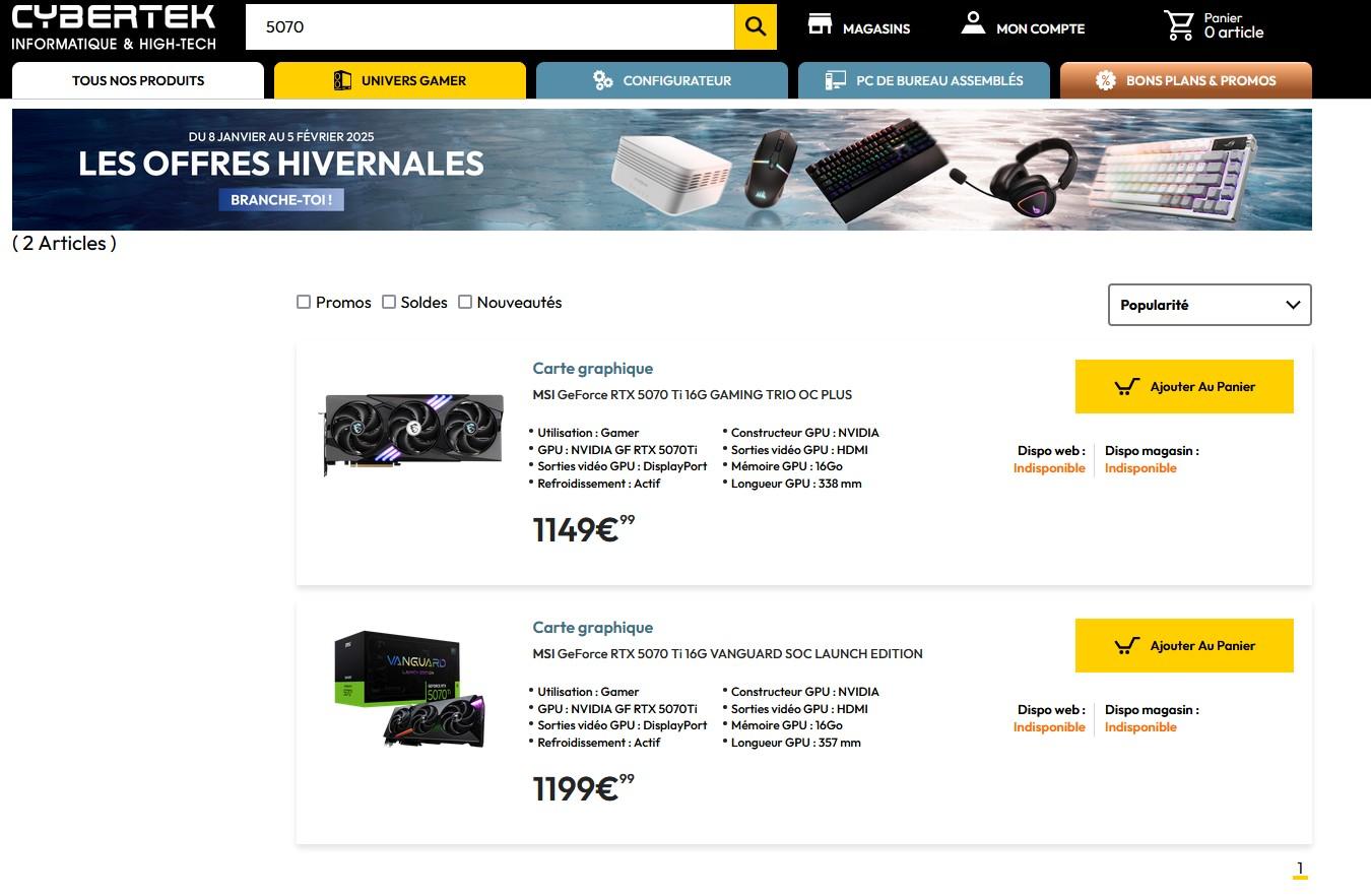 Tant chez Grosbill que directement chez Cybertek, la MSI GeForce RTX 5070 Ti 16G GAMING TRIO OC PLUS est affichée à 1149,90 euros. Il faut consentir à 50 euros supplémentaires, soit à une facture de 1199,90 euros, pour la MSI GeForce RTX 5070 Ti 16G VANGUARD SOC LAUNCH EDITION.