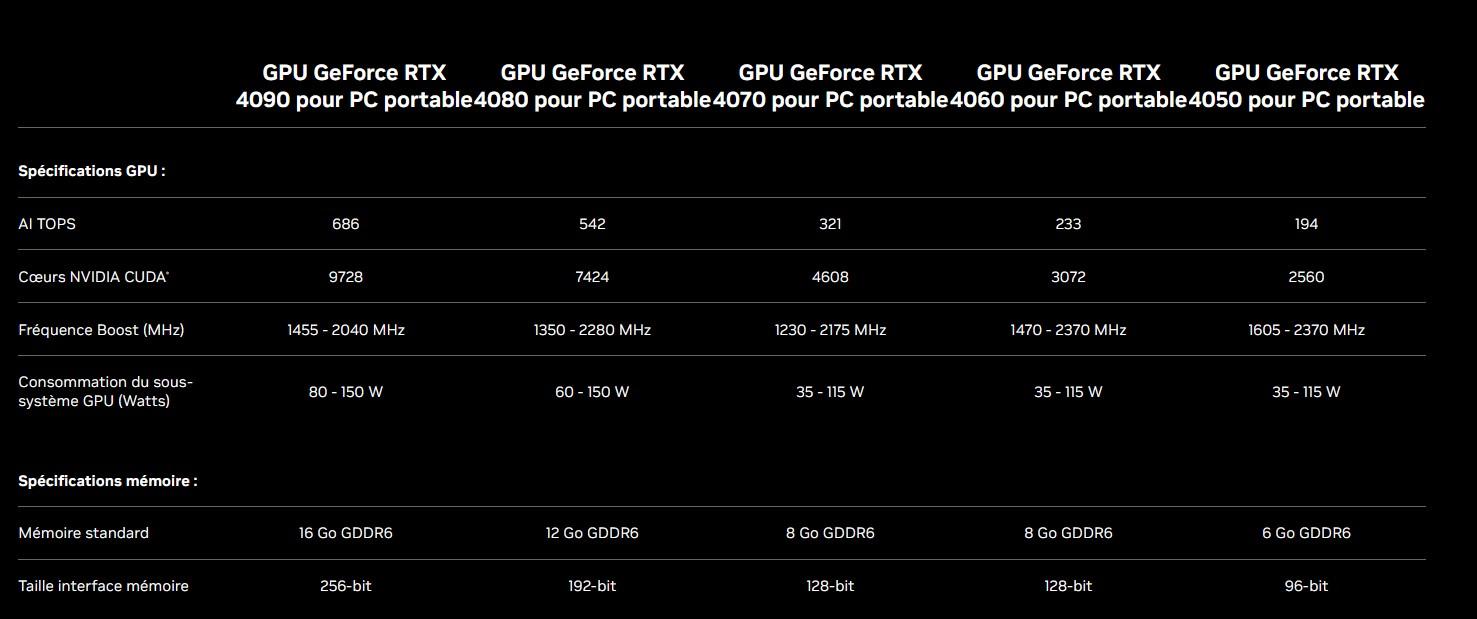 | Carte graphique | GPU | Cœurs CUDA | VRAM | TGP |